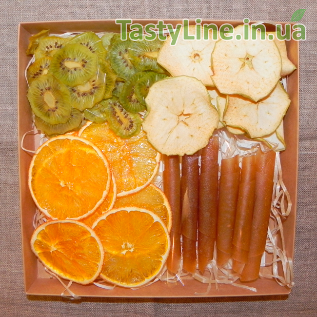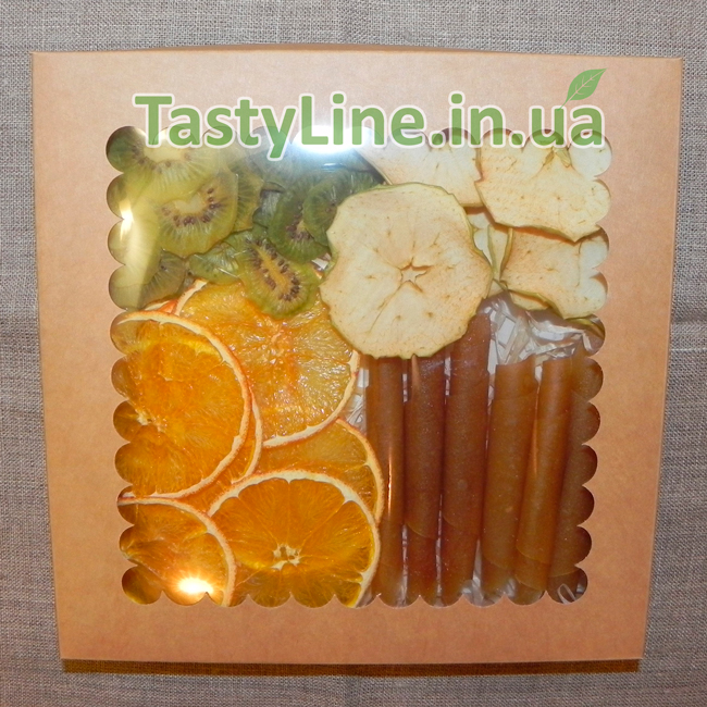 Подарочный набор может состоять из любых фруктовых чипсов и видов пастилы, доступных к заказу на сайте.
